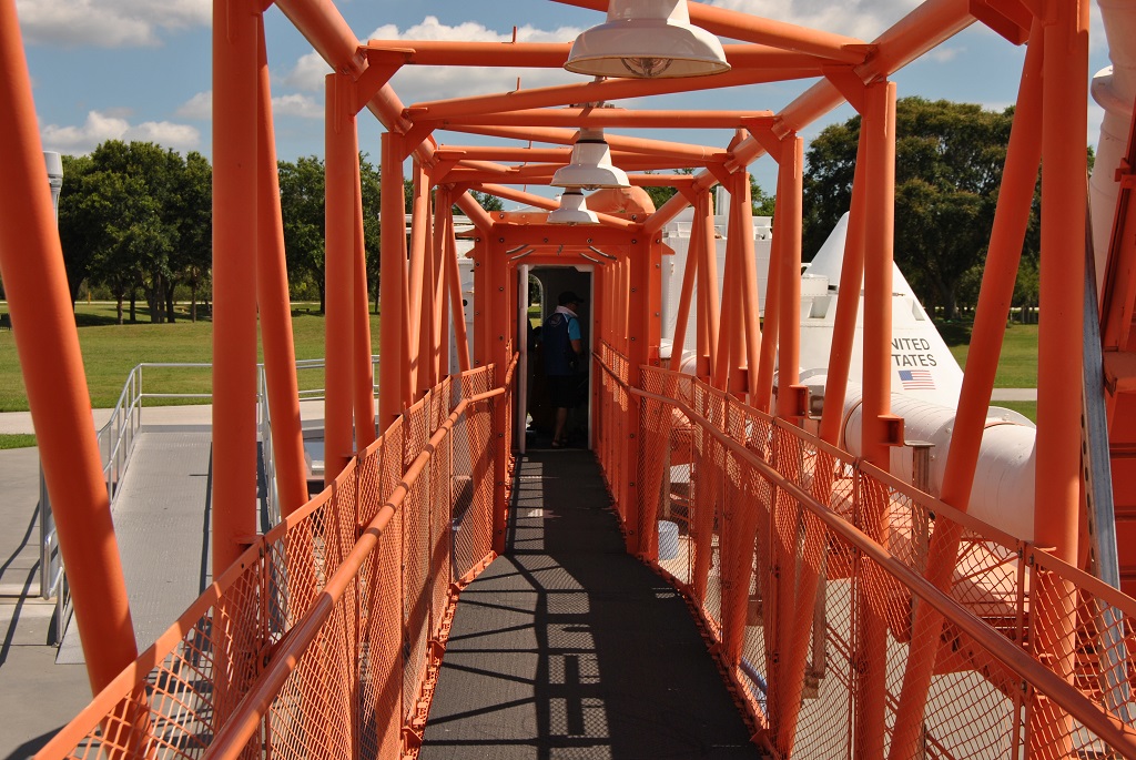 The next day (May 27, 2010)we went to "Kennedy Space Centre" (KSC). From far you can see the 160 meter (525 feet) high Vehicle Assembly Building (VAB). On the KSC complex was very much to see. First a short walk through a small museum, then a guide tour through the rocket garden, where we could walk over the original bridge that was used to let Neil Armstrong walk to the capsule of the Apollo 11, the first moonwalk. Then we did take the bus for a tour over the complex, to the lookout point near the launching platforms (LC39A en LC39B), used for Apollo (1961-1972) and Space Shuttle. In the future (2018-2021) these platforms will also be used for the Constellation Project. This trip did bring us also to the Apollo museum. If you can remember that era, it is a very nice and impressive museum. At the end we did look into a real Space Shuttle. We did not expect before that there was so much to see that one day was nearly enough. At the end of that day we did take a Hotel in Cocoa Beach, just below Cape Canaveral.