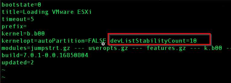 Note: If the path remains as /tmp/, you must reboot the ESXi host and increase the devListStabilityCount value in the boot option line (see earlier steps).
